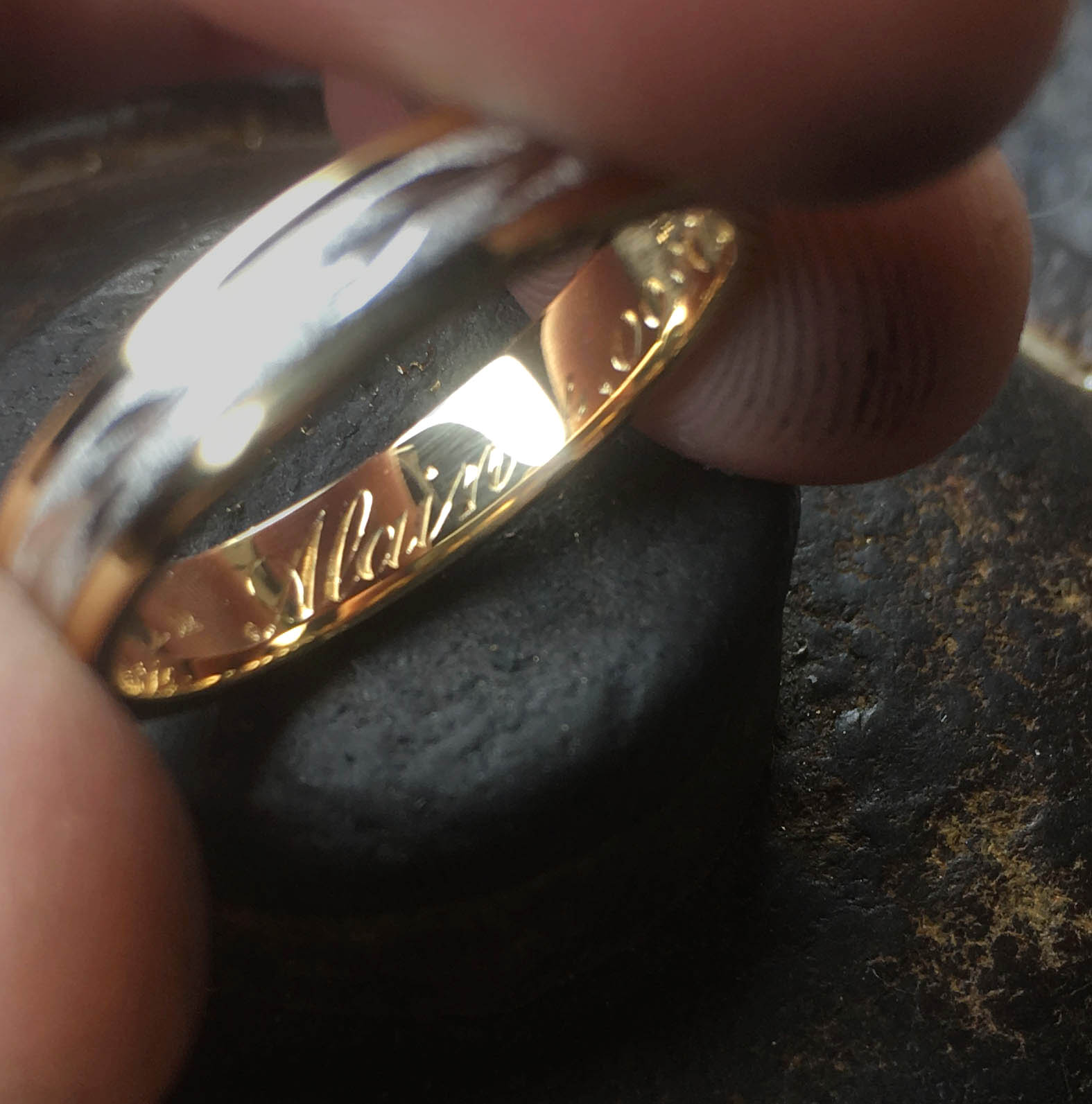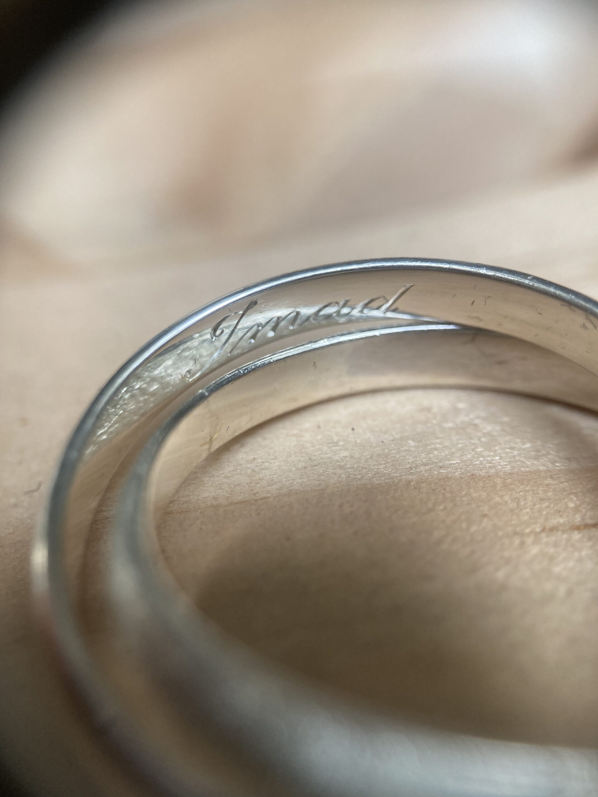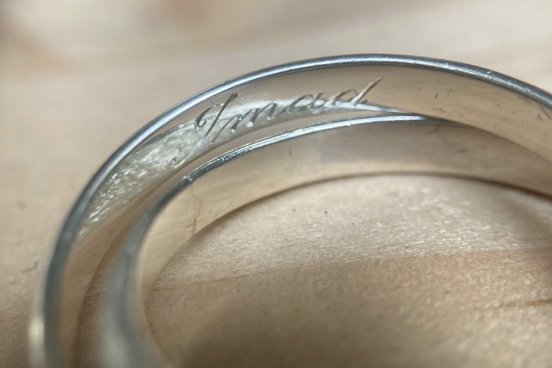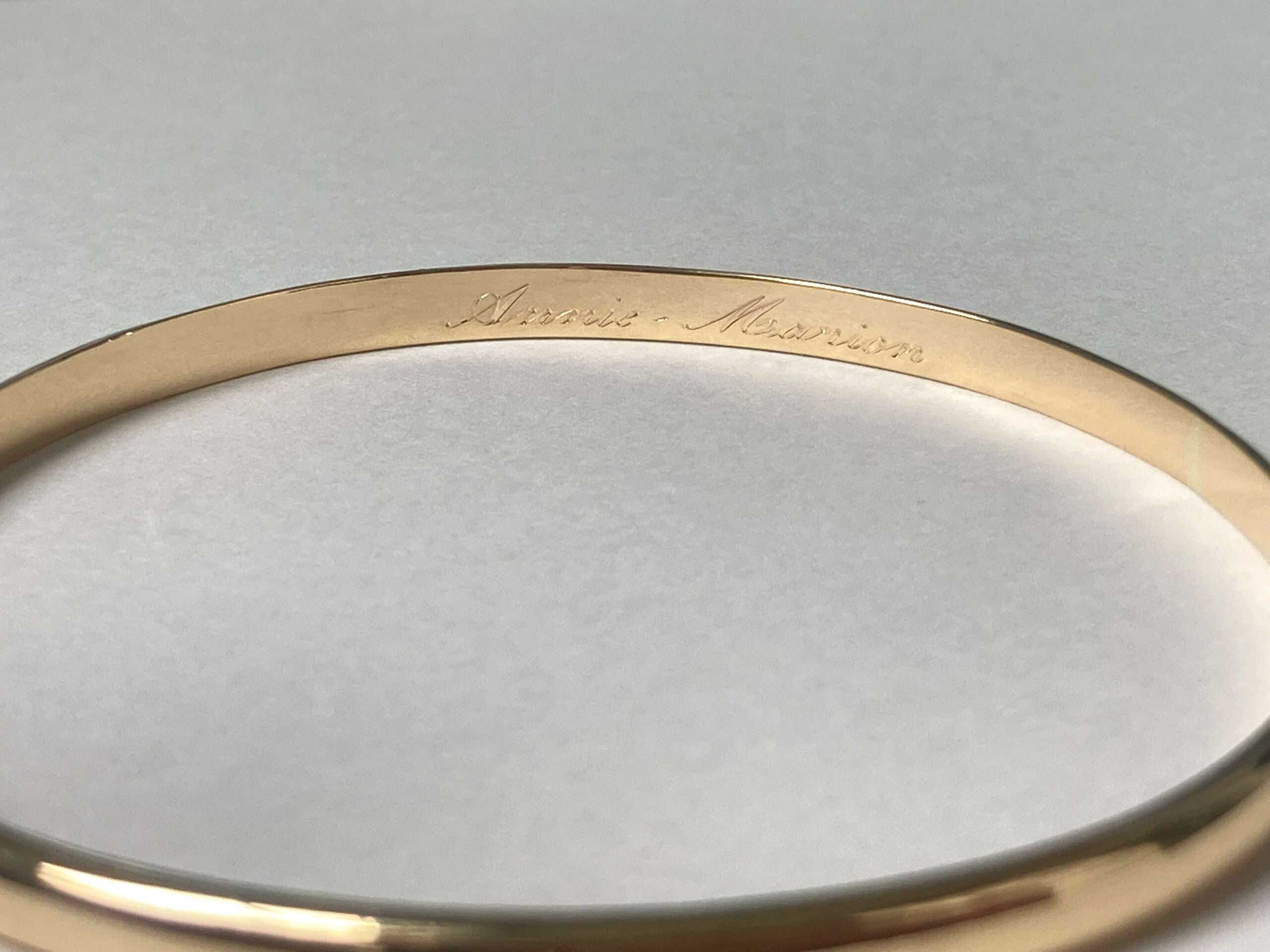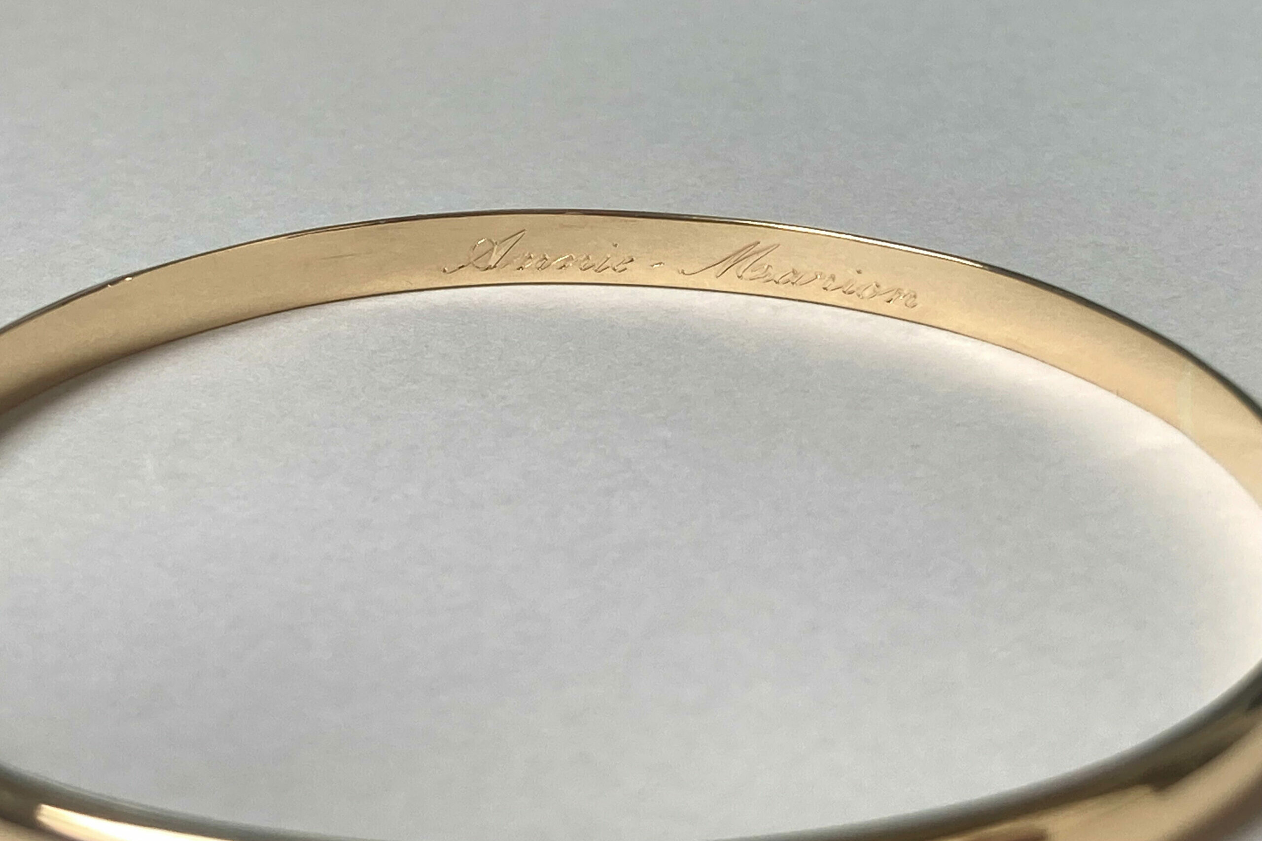 La gravure à l’intérieur d’une alliance ou d’une bague est un exercice particulièrement délicat. L’espace est réduit, courbé, peu accessible. Cela demande des outils spécifiques et une dextérité remarquable.