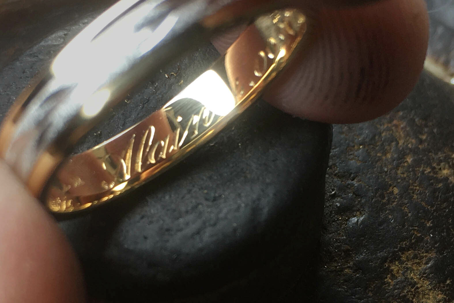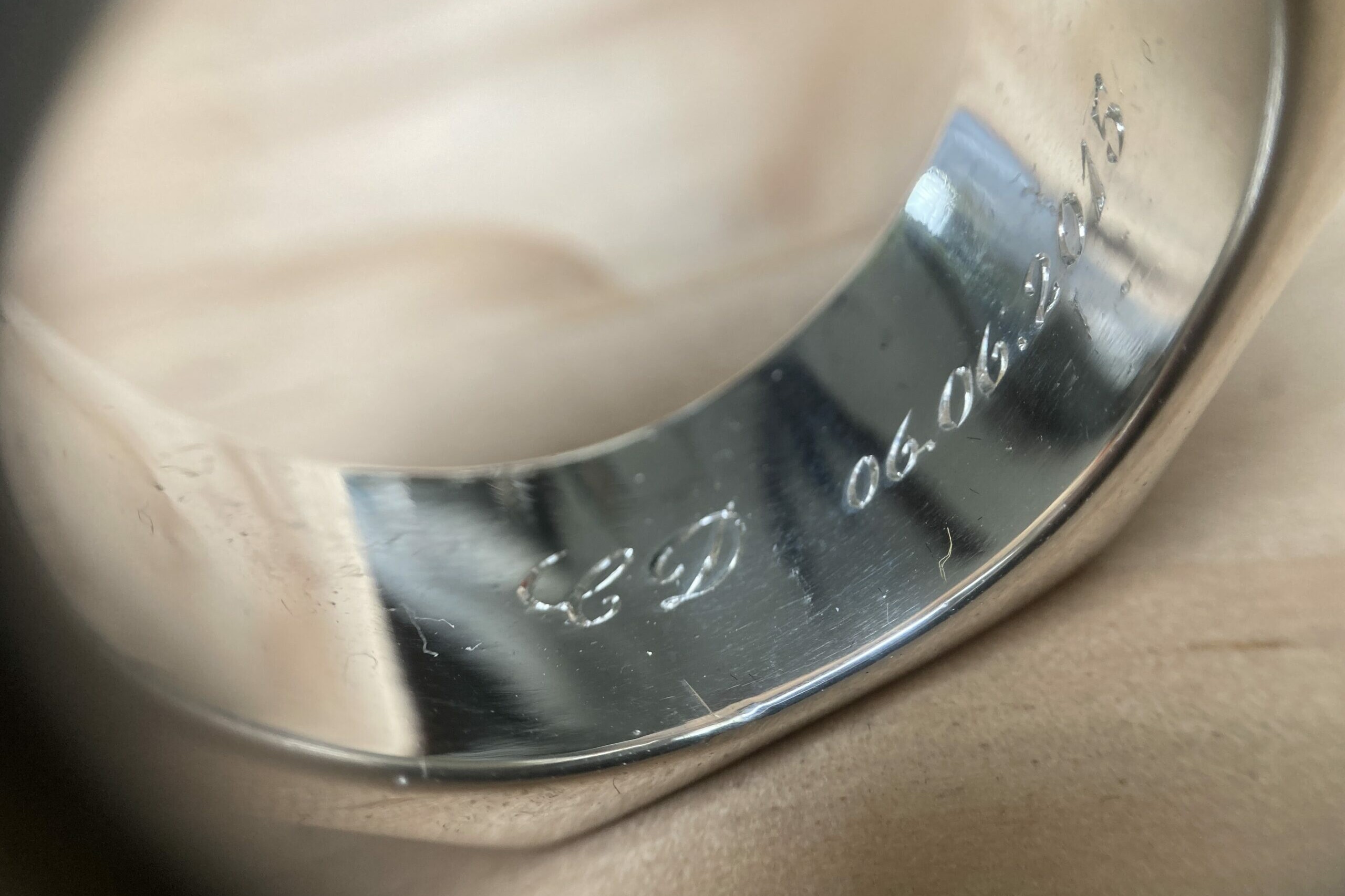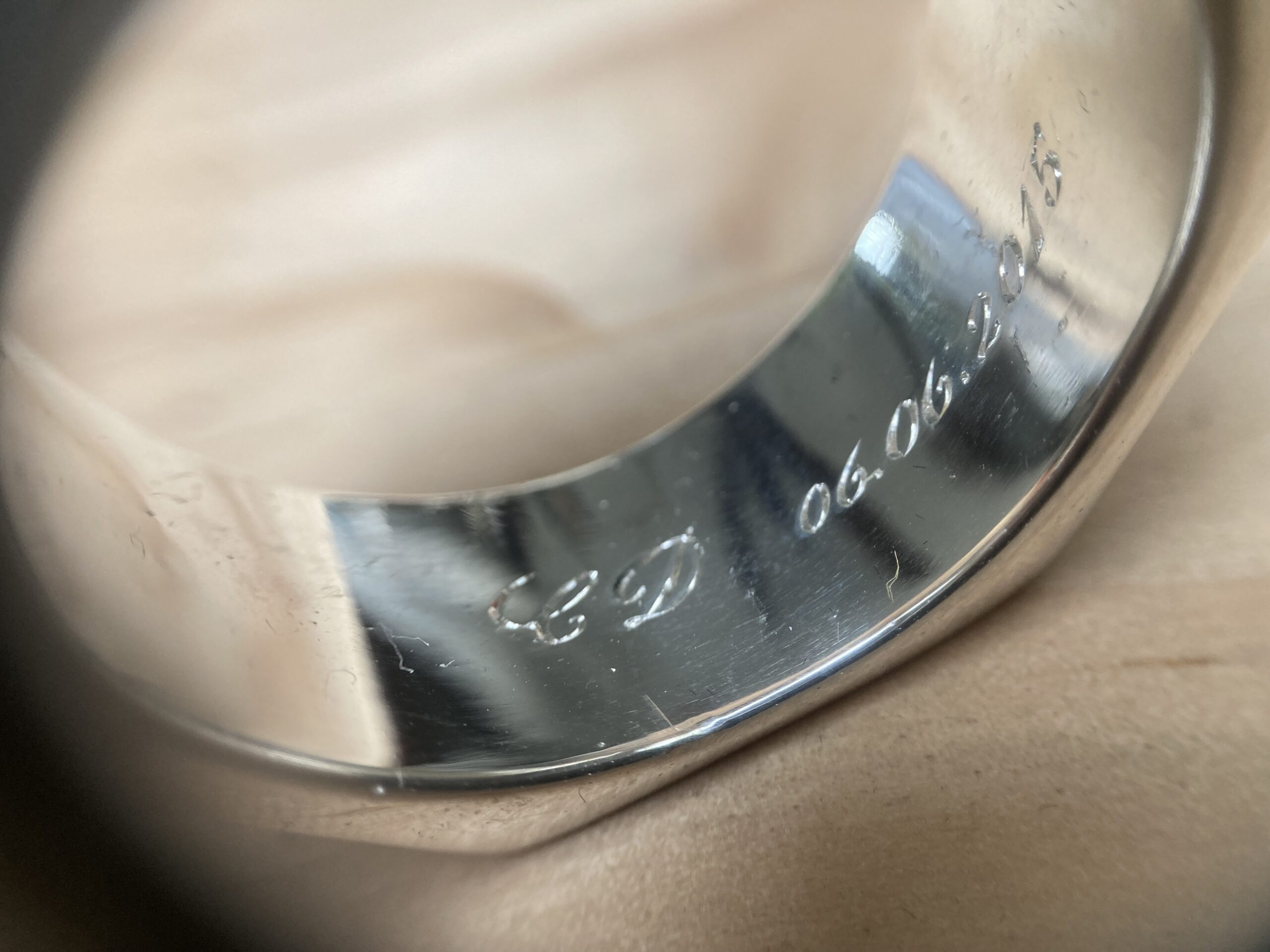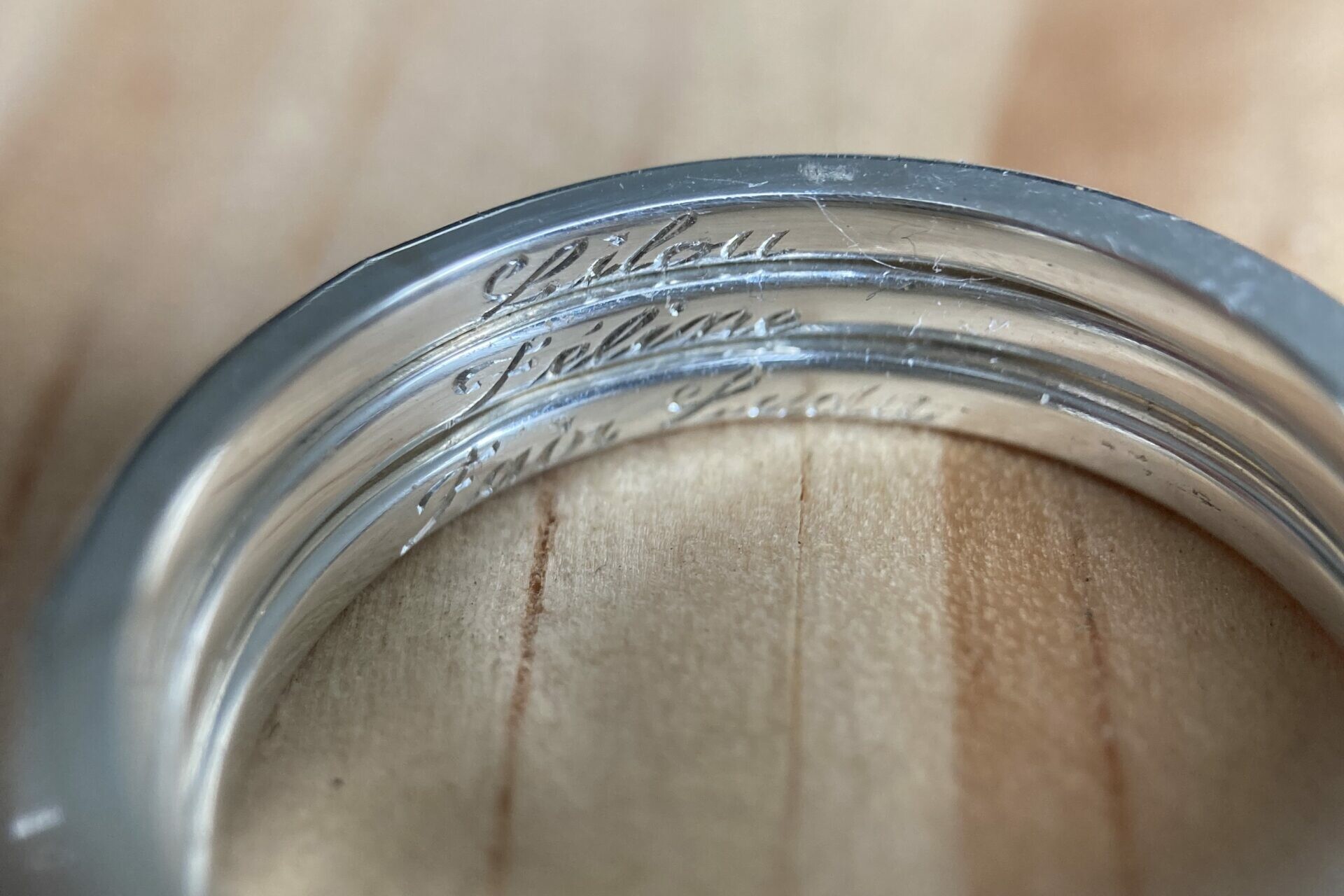 La gravure à l’intérieur d’une alliance ou d’une bague est un exercice particulièrement délicat. L’espace est réduit, courbé, peu accessible. Cela demande des outils spécifiques et une dextérité remarquable.